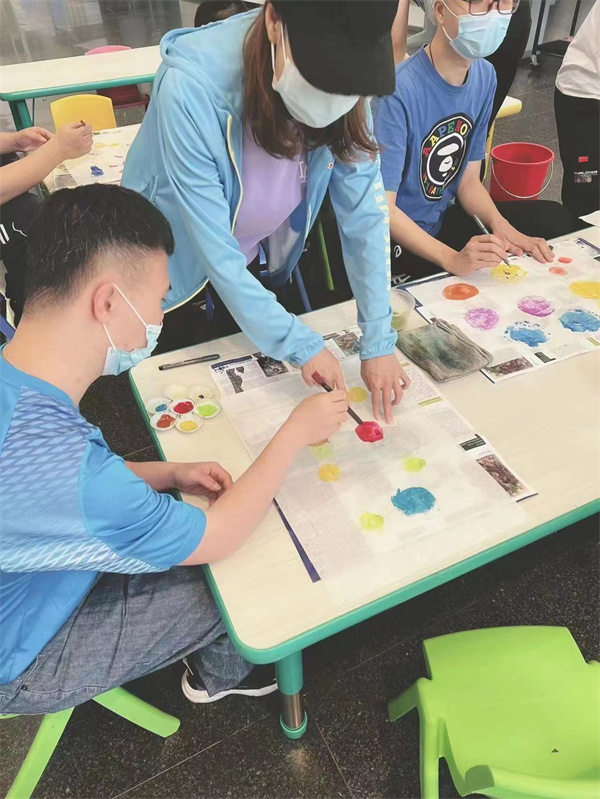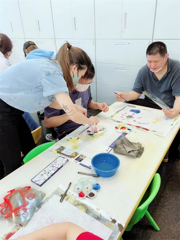 學員與義工一同體驗工作坊,並且透過共同創作畫作,可以促進共融外,亦可透過彼此交流,提升學員的表達與溝通能力,同時亦為學員擴闊社交生活圈。