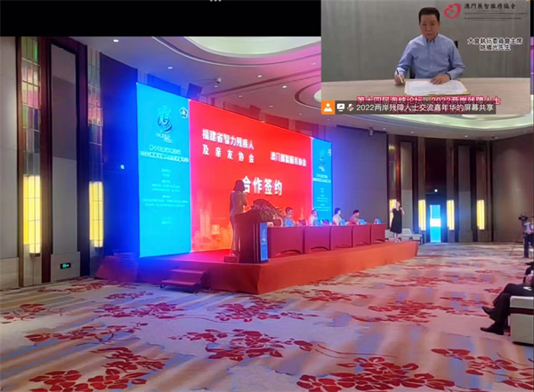 由中國殘疾人聯合會主辦,福建省殘疾人聯合會、台灣中華青年交流協會、平潭綜合實驗區管委會、廈門市殘疾人聯合會承辦的“同胞攜手 大愛無疆”第十四屆海峽論壇·2022兩岸殘障人士交流嘉年華活動於7月12日在福建廈門舉辦。以“共同創造殘疾人美好生活”為主題的嘉年華論壇和合作簽約儀式,主辦單位邀請澳門5個殘疾人康復機構作為活動的交流夥伴,澳門展智服務協會(前澳門弱智人士服務協會)很榮幸成為其中一個指定合作單位,因受疫情影響,本會大會執行委員會主席姚繼光先生於線上進行簽訂合作協議儀式,本會致力與同胞們共同創造殘疾人美好生活。齊促進海峽兩岸融合發展,加強閩台、粵港澳大灣區殘疾人事業溝通交流合作,讓兩地智力殘疾人及其家庭,本著平等互惠、共同發展的原則,殘疾人士服務體系建設必定取得積極發展。
