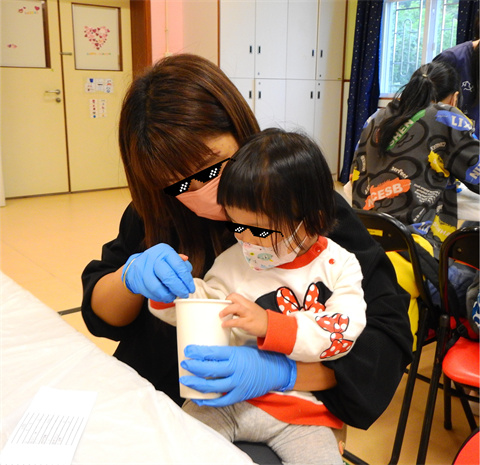 家長和幼兒一同攪拌護膚品的材料至均勻