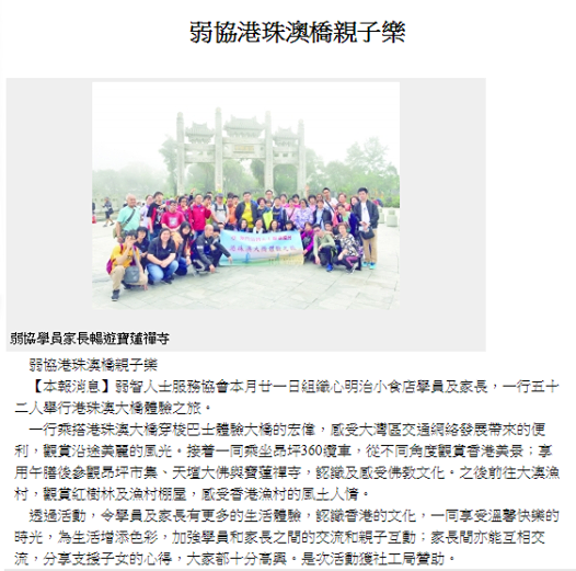 【本報消息】弱智人士服務協會本月廿一日組織心明治小食店學員及家長,一行五十二人舉行港珠澳大橋體驗之旅。