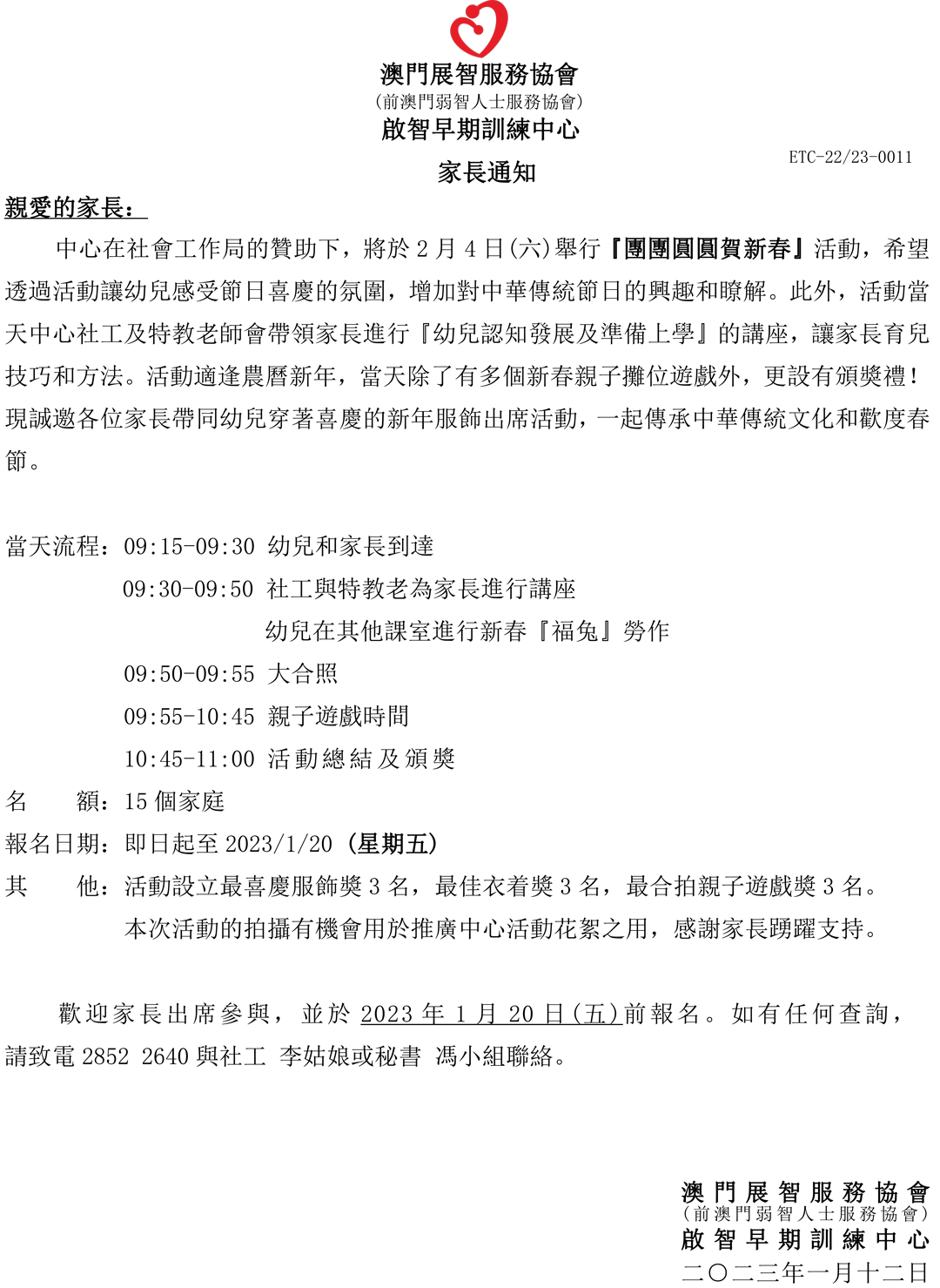 (活動預告)啟智早期訓練中心-團團圓圓賀新春通告