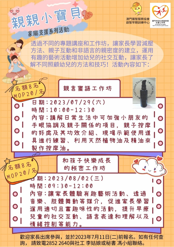 啟智早期訓練中心將在社會工作局的資助下舉辦兩場《親親小寶貝》家屬支援系列活動,7月29日星期六(親言蜜語工作坊)和8月2日星期三(和孩子快樂成長的秘密工作坊),地點:啟智早期訓練中心。