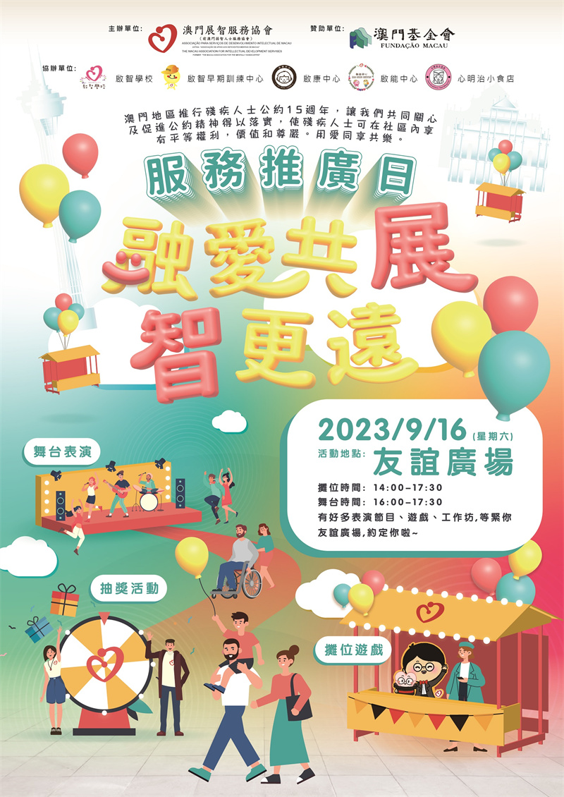 適逢本年是《殘疾人權利公約》於本澳推行第十五周年,公約的宗旨是促進、保護和確保所有殘疾人士能充分和平等地享有一切人權和基本自由,並促進對殘疾人士固有尊嚴的尊重;因此,本年本會的服務推廣日以《殘疾人權利公約》為主題,以不同的攤位遊戲、表演及產品義賣等方式與市民大眾普及公約的精神及其宗旨,現本會將於2023年9月16日(星期六)下午14時至17時30分假友誼廣場舉辦『融愛共展·智更遠』服務推廣日活動,屆時將有豐富的遊戲禮品及抽獎活動,現誠邀 閣下及親友蒞臨,一同助力構建共融和諧社區,有關推廣活動詳情如下: