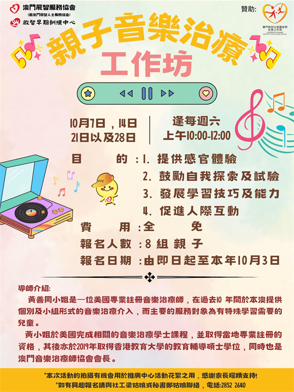 本⼯作坊旨在透過⾳樂治療介⼊及家⻑教育,促進參加幼兒的⾝⼼發展和正面情緒,並提升照顧者對⾳樂活動的理解及運⽤技巧。