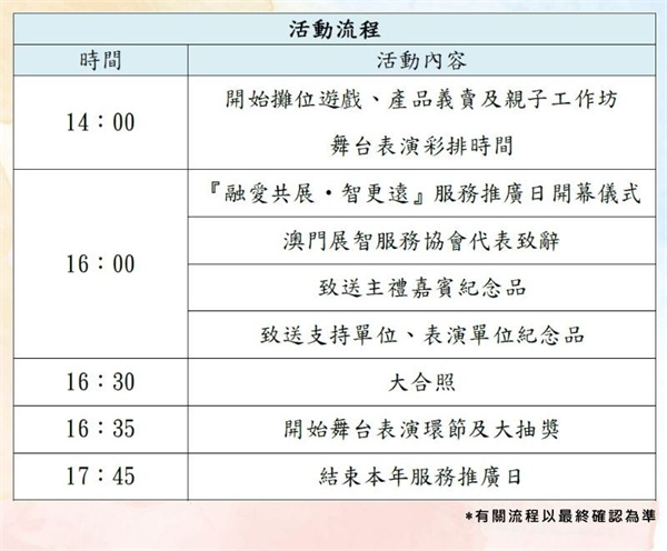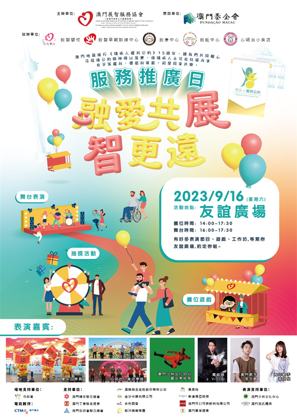 澳門展智服務協會於9月16日服務推廣日,會為大眾準備了多項精彩的表演,包括: