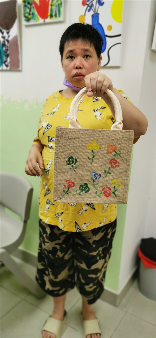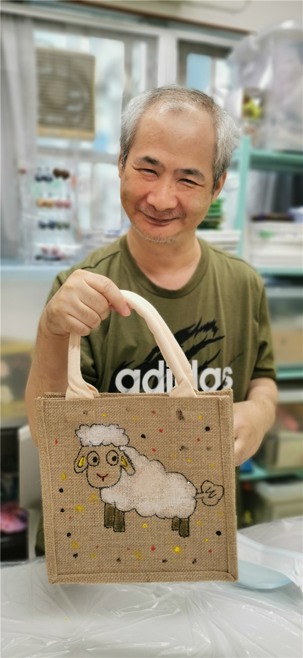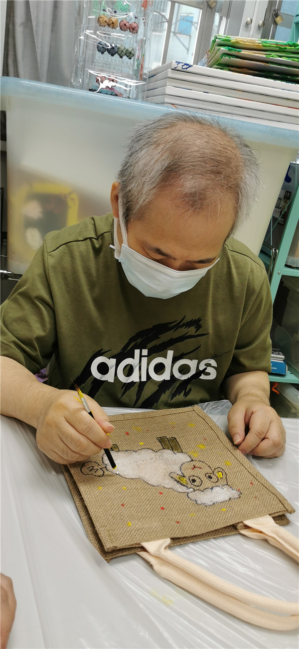 第二部份是自由創作:先在紙張上起稿,構想好自己的圖案,然後按照構思好的草圖用亞克力顏料畫在環保袋,最後塗上美麗顏色,便完成了獨特的環保袋,服務使用者看到自己的作品都開心滿足。