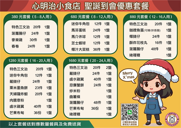 心明治小食店今個聖誕推出到會優惠套餐,給大家辦聖誕派對提供更多餐飲選擇,每份套餐贈送對應數量的餐具,以及免費送貨,歡迎預訂。