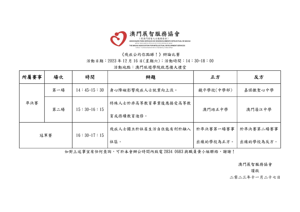 大家最近好嗎?天氣慢慢變凍啦,大家記得平日多穿保暖的衣物喲!由澳門展智服務協會主辦、澳門基金會贊助、澳門旅遊學院作地支持單位以及澳門演辯文化協會作支持單位的【《殘疾公約你點睇!》辯論比賽】將於12月16日(星期六)下午14時30分至18時假澳門旅遊學院啟思樓大禮堂舉行,有關各場賽事的辯題及正、反方代表,己於上週五完成抽籤環節,以下為各場賽事辯題正、反方的抽籤影片及賽事的資料表,如有任何查詢,可致電2834 0683與本會職員黃小姐聯絡,謝謝!