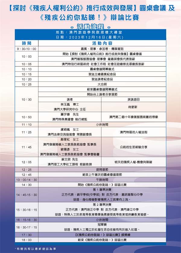 由澳門展智服務協會主辦、澳門基金會贊助、澳門旅遊學院作場地支持單位以及澳門演辯文化協會作支持單位的【探討《殘疾人權利公約》推行成效與發展】圓桌會議及【《殘疾公約你點睇!》辯論比賽】將於12月16日(星期六)假澳門旅遊學院啟思樓大禮堂舉行啦!