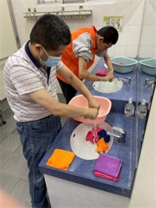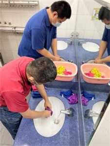 同時,外出接觸社區和社區到訪的團體的場合逐漸增多,環境的清潔度、衛生疾病、個人清潔行為需要磨練、提醒、重覆練習,讓智障學員融入社會時、回到家中時,都可以有自信地、可平穩地表現。