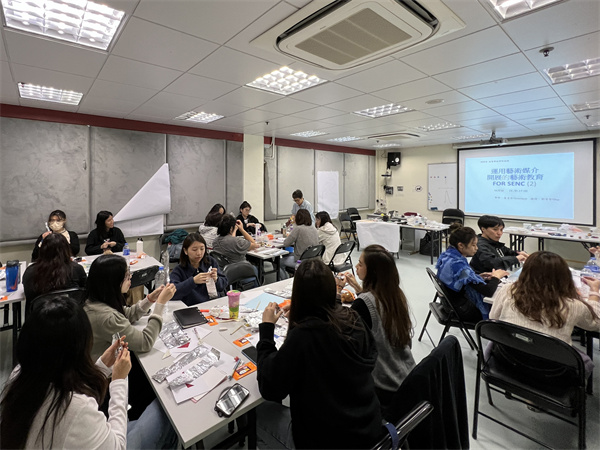 為提高教學人員的藝術教學技能,啟智學校特邀本地資深藝術教育導師,帶領該校教師進行為期兩天的「運用藝術媒介開展特殊教育兒童的藝術教育」培訓活動,活動中各人需化身成為學生親自體驗及感受,通過豐富、多元和日常的材料進行各種藝術活動,過程中教師們十分投入且享受其中,並表示增進了相關知識和藝術教學技巧,亦意會到學生除學習必需的技能外,更應多嘗試接觸不同的物料,多給予時間和空間讓其發揮創意,感受藝術的美與樂趣。