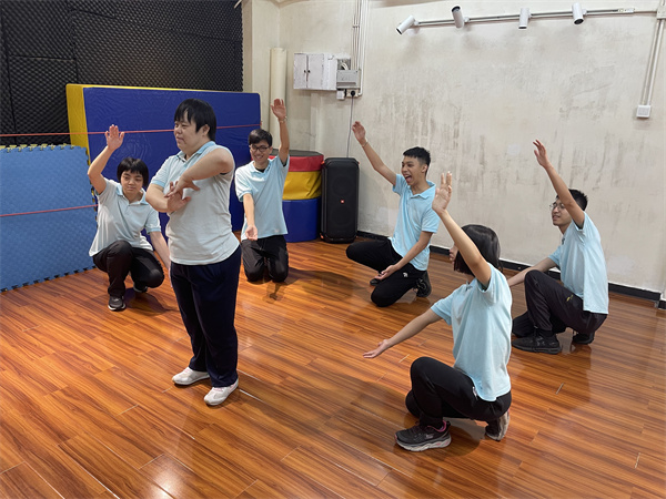 表演對於智障人士來說是難得而又可貴的,能真正走上舞台的學員比列也只有參與者的30%。為了使他們能更多的參與,我在課堂上以舞台標準來進行教學,由走位開始,強化動作的規範和整個團隊節奏相統一,不斷強化記憶,反復練習,在練習中一步步達到最佳效果。練習中也需不斷觀察他們是否接受,同時需要他們想象自己在舞台上的感覺,盡量發揮出每個人的個人特色。用輕鬆愉快的課堂氣氛使他們融入舞蹈的世界,并展現所學所練。