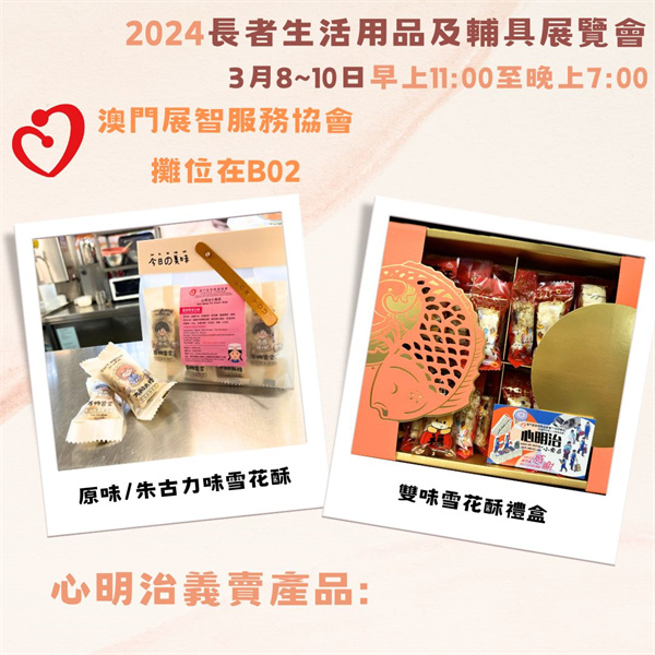 2024年長者生活用品及輔具展覽會將於3月8日至10日在漁人碼頭會議展覽中心舉行,感謝主辦單位澳門護老者協會邀請本會參加是次活動,本會派出屬下三間機構心明治、啟能中心和啟康中心共同參展義賣,帶來很多學員精心製作的產品,有美食、飾物和小擺設等等,希望大家多多支持!