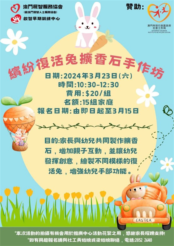 目的:家長與幼兒共同製作擴香石,增加親子互動,並讓幼兒發揮創意,繪製不同模樣的復活兔,增強幼兒手部功能。