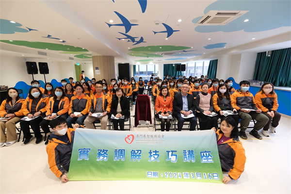 澳門展智服務協會上周六上午於茵豪薈啟智早期訓練中心舉辦“實務調解技巧講座”,由香港導師周美華講解調解技巧要訣,於面對衝突時如何有效發揮作用,提高溝通效率。是次培訓該會理事代表及員工共七十二人參與。