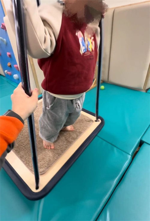 平台韆鞦:是感覺統合治療中常見的治療活動,一般會讓孩子以坐姿在韆鞦上在搖擺時執行一些拋接球,取球投向目標,套圈圈等活動,亦可以請孩子在韆鞦上作一些姿勢變換,如圖中孩子是由坐姿轉換成站姿,也可以從坐姿轉換成跪姿。孩子在搖擺時會接受到大量的前庭覺刺激,再配合不同的治療目標及相對應的活動,讓孩子在訓練過程改善其姿勢控制,手眼協調,動作計劃等能力。
