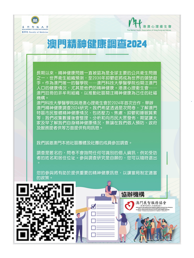 澳門科技大學醫學院與港澳心理衛生會於2024年首次合作,舉辦澳門精神健康調查2O24研究。我們希望透過是次問卷,了解澳門特區市民整體精神健康情況,包括壓力、焦慮、抑鬱和睡眠質素等;我們收集數據後會整理、分析和向市民大眾發佈,期望讓大家及早了解我們自身精神健康情況,無論在我們個人預防、政府及服務提者供等方面提供有用訊息。