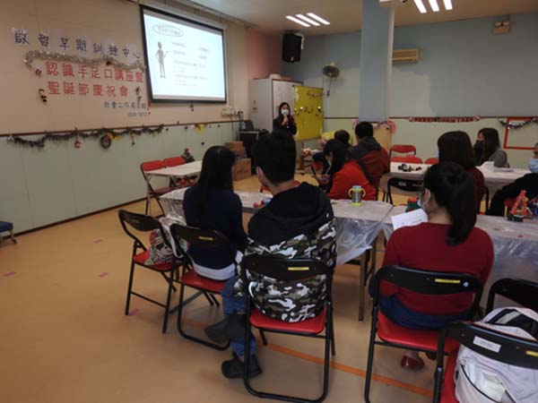 啟智早期訓練中心-透過講座形式能名認識手足口的成因、迷思和預防方法,讓家長對手足口病有所了解外,還增設語言治療資訊的講座,家長也從活動中獲益良多。此外,中心為學童及其家庭舉辦聖誕節慶祝會,透過以親子形式製作聖誕老人置物盒外,還有學童親自動手完成「驚喜聖誕樹」的禮物送給其家人,場面既溫馨又愉快,活動由社會工作局資助。
