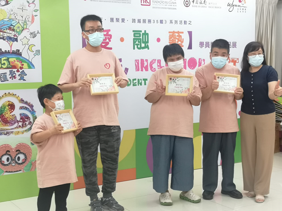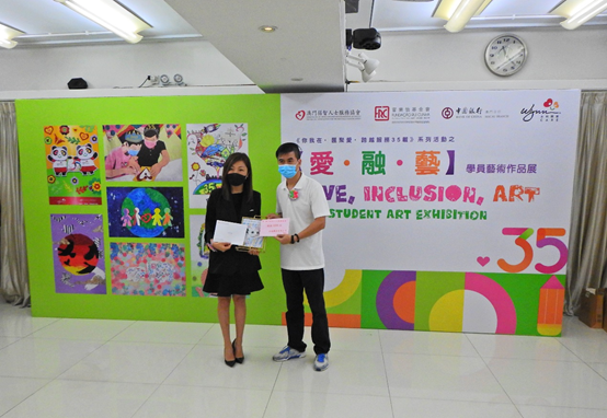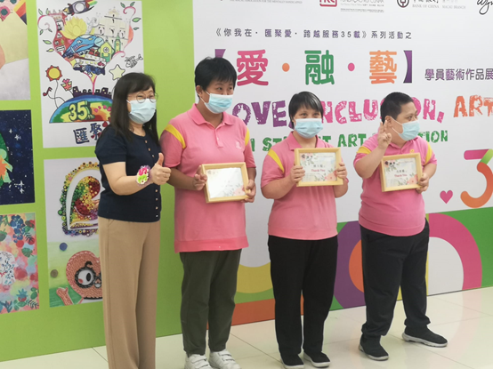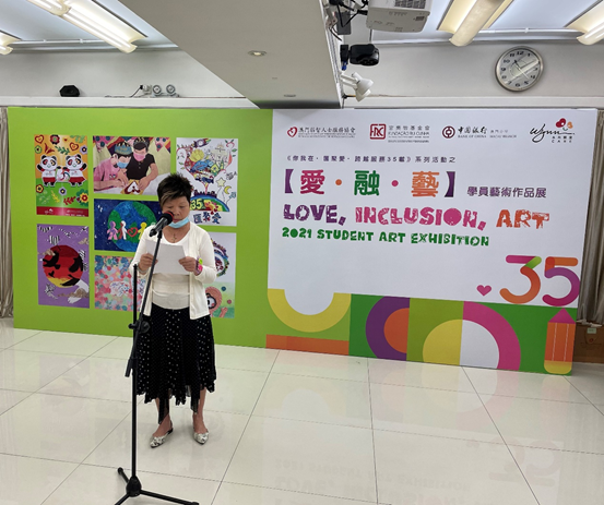 澳門弱智人士服務協會於2021年8月30日(星期一) 於澳門官樂怡基金會畫廊舉辦《你我在•匯聚愛•跨越服務35載》系列活動 之「愛·融·藝」學員藝術作品展開幕禮,今年作品展以數字三十五為題材,於8月30日至9月2日一連四日以不同的畫作風格及手作作品呈現主題創作,同時帶出另一意義,本會成立至今,一直堅持多元發展,秉持結合藝術與治療,就日常的活動及治療過程中,加入藝術元素,培養服務使用者對藝術創作上的興趣,使他們的藝術作品與成就得到更多社會大眾的認識與肯定。