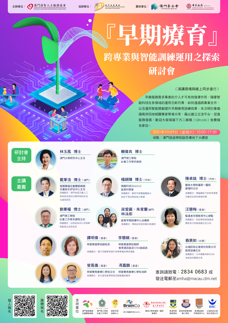 早療服務需多專業的介入才可有效發揮作用,隨著智能科技在各領域的運用日新月異,如何通過跨專業合作,以及運用智能開創提升早期療育訓練效果,本次研討會邀請兩岸四地相關專家學者分享,藉以建立交流平台,促進服務發展。歡迎大家掃描下方二維碼(QRcode)免費報名參加。