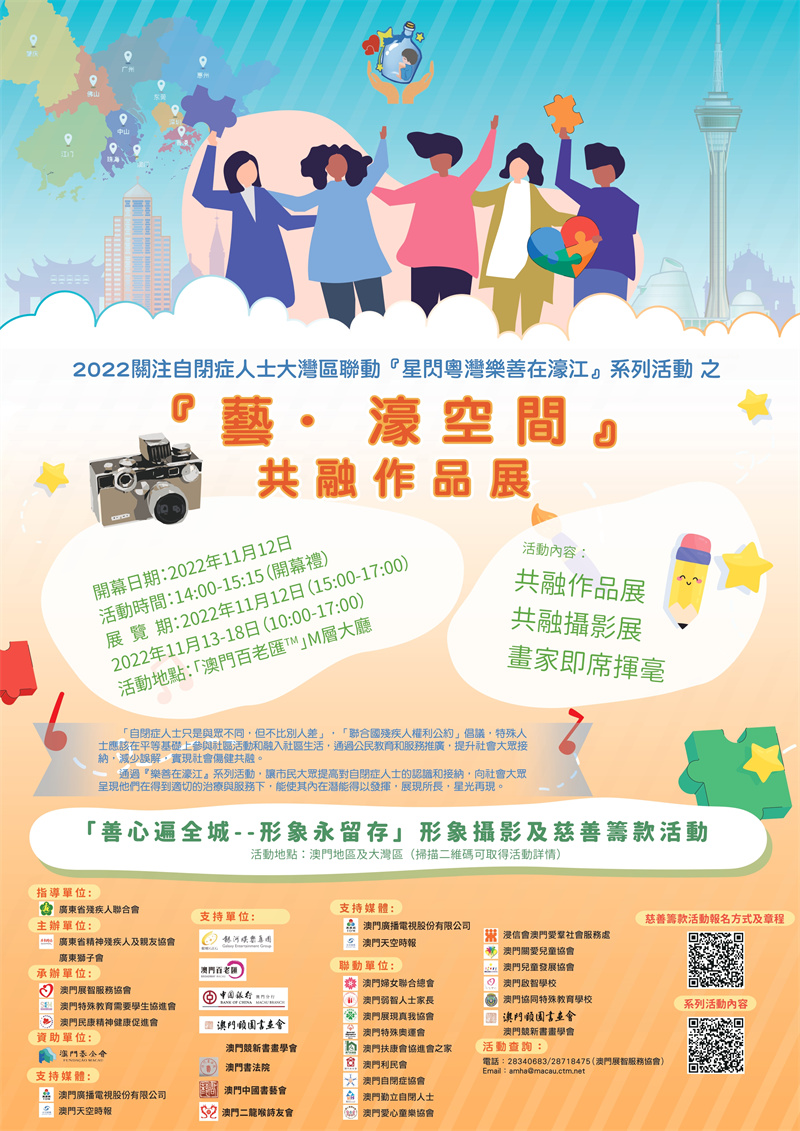 本會現謹訂於11月12日(星期六)14:00至15:30假「澳門百老匯」M層舉辦名為『星閃粵灣樂善在濠江』之『藝・濠空間』共融作品展活動,是次展覽為期6日,屆時共展出33幅畫作作品及9件立體作品以及15幅親子共融拍攝照,以下表格為活動當日的簡易流程: