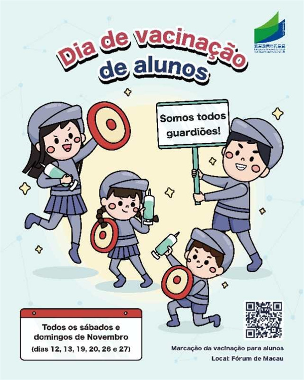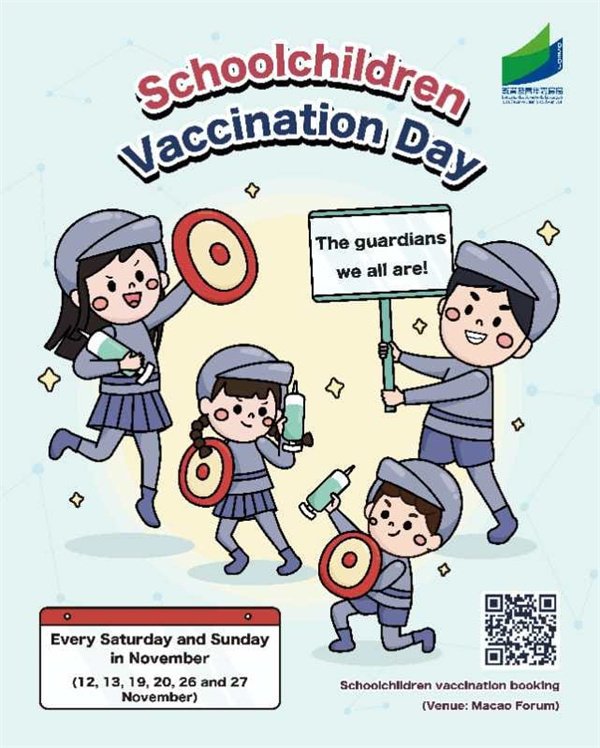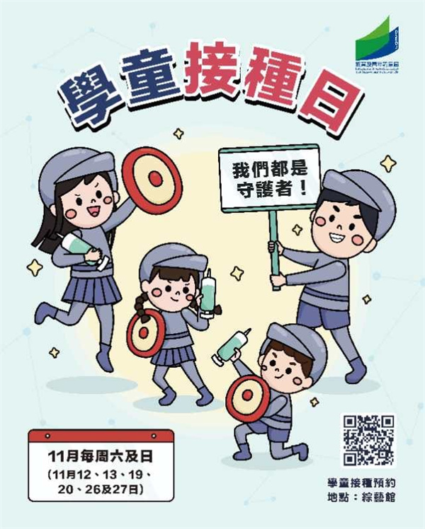為持續推動學童接種新冠疫苗,預防及減低重症及死亡風險,教育及青年發展局與衛生局繼續於十一月每周六、日進行 “學童接種日”,讓家長儘快為年滿3歲而未接種新冠疫苗的子女及時接種。