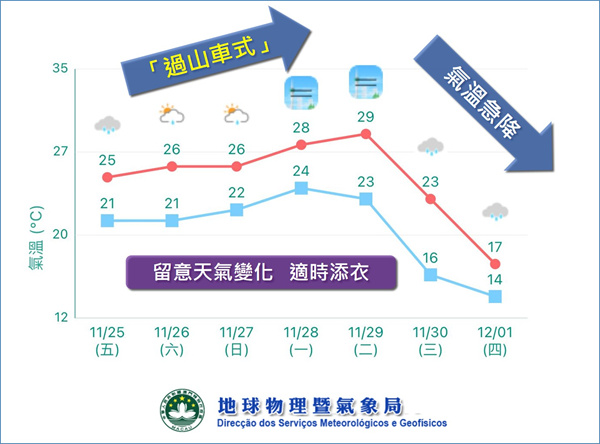 由於預期下週將出現“過山車式”先升後降的氣溫變化,加上由暖濕轉為大風陰雨的天氣,氣象局提醒市民出門前多留意天氣變化,適當增添衣物,並加強關注家中長者及年幼孩童的健康。