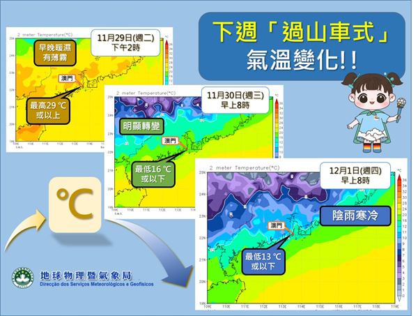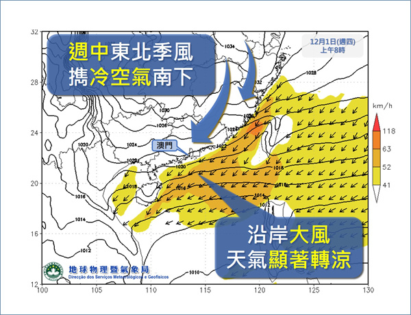 下週三晚,本澳逐漸轉受較強東北季風影響,冷空氣大舉南下至廣東沿岸,北風增強,伴隨有幾陣雨,週四至週五氣溫將進一步下降,由於大風加上持續天陰有雨,寒冷的感覺會更加明顯。(圖2)
