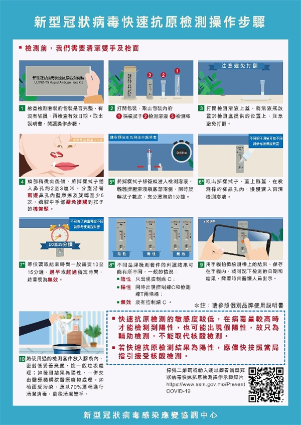 快速抗原檢測操作步驟、結果申報及使用注意事項,詳見以下連結(https://www.ssm.gov.mo/apps1/covidagtest/ch.aspx);