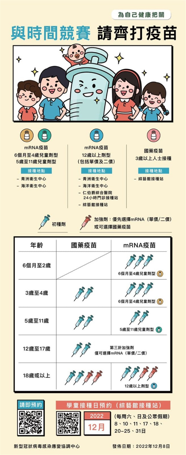 為應對疫情,與時間競賽,接種新冠疫苗刻不容緩。接種新冠疫苗可降低重症及死亡風險,為自己及孩子健康把關。教青局透過圖文包把新冠疫苗最新資訊向家長說明,需留意不同年齡接種不同劑型、劑次及接種地點的安排,持續於12月每周六、日及節假日在綜藝館舉辦 “學童接種日”,便利家長儘快為已入學而未接種新冠疫苗的子女接種。
