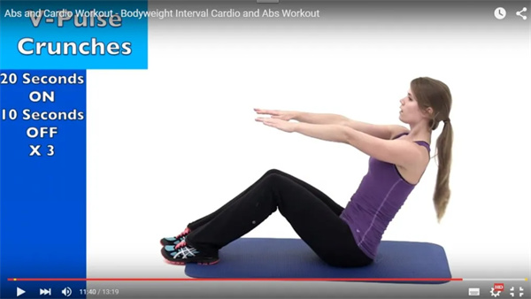 一個可能大家覺得看起來比較沒什麼效果,好像看起來也很輕鬆,但是,這可能是所有項目裡最容易累的,因為你的雙腳是要像黏在地板上一樣,要固定著不可以離開,然後雙手要舉高,平舉到肩膀的高度。最主要運動到的地方,就是我們”最大的敵人”-小腹,像是在畫一個V字一樣,運用上半身的肌肉帶動前後有規律地擺動,可以先從小V開始練習,再開始慢慢地拉大前後擺動的幅度,慢慢變成大V,小編在這項運動的時候,一下子的功夫,就滿身大汗了…,但是做得很開心,因為可以燃燒相當多的熱量,可以把晚上吃的大餐熱量全部消耗掉了…,就不會帶著罪惡和埋怨睡覺了!