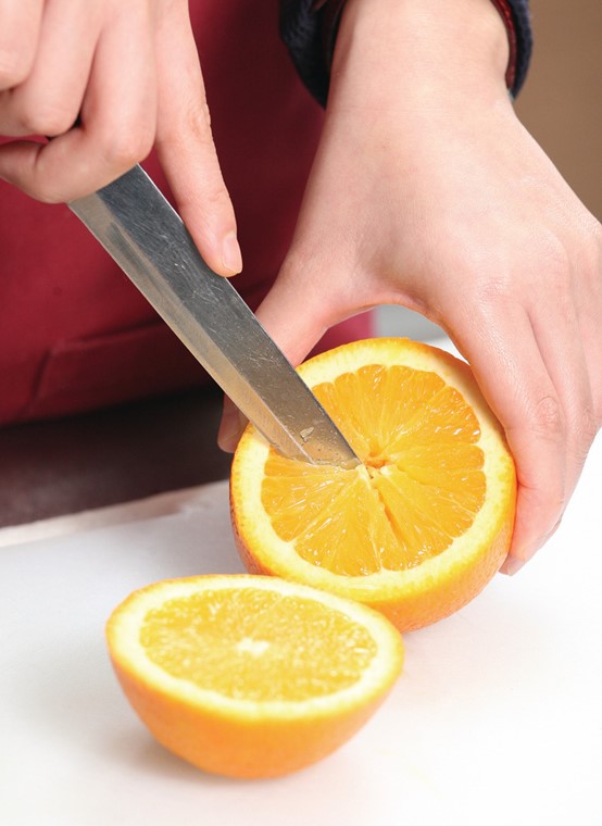 洗淨橙,切半,在兩半橙肉上用刀各鎅數刀。