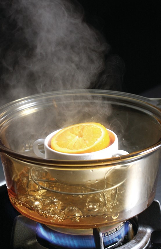3. 將橙合起放入飯碗,再放入煲內蓋上煲蓋,隔水燉煮15至20分鐘即成,可用湯匙刮果肉果衣連汁同吃,碗內的水也應喝掉。