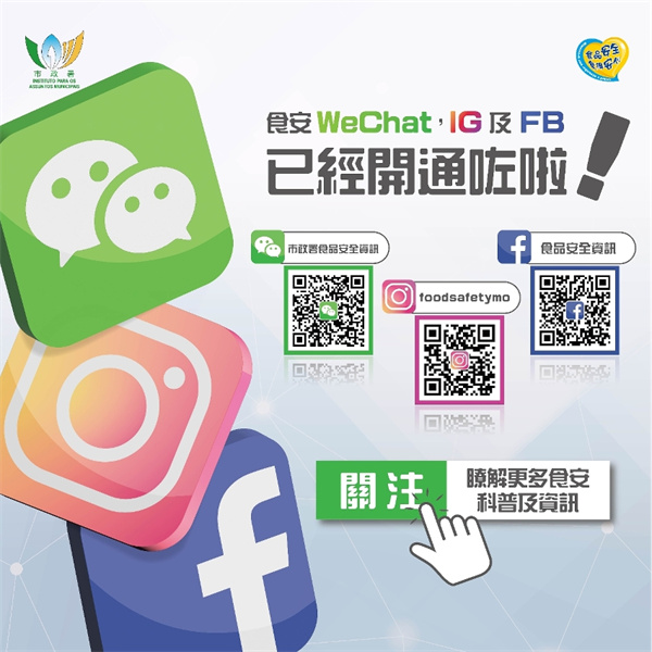 因應市民使用手機上網及透過社交媒體獲取資訊越趨普及,市政署已開通“食品安全資訊"社交媒體平台專頁,包括微信訂閱號、Facebook專頁,以及Instagram帳號,豐富網上發佈渠道,擴大接觸層面,持續線上線下推動食安風險教育。透過各社交媒體平台,適時發佈簡單易明的圖文資訊,向食品業界及市民傳達正確的食安資訊,內容涵蓋:食安政策及新聞、食品預警、季節性食安風險;亦會因應網絡熱議的食安傳聞製作有關科普常識,剖析傳聞的真假,傳遞正確的食安觀念。同時,市政署亦會不定期舉辦食安網上遊戲活動,藉輕鬆有趣的方式推廣食安觀念;歡迎市民及食品業界持續關注,共同為食安把關。