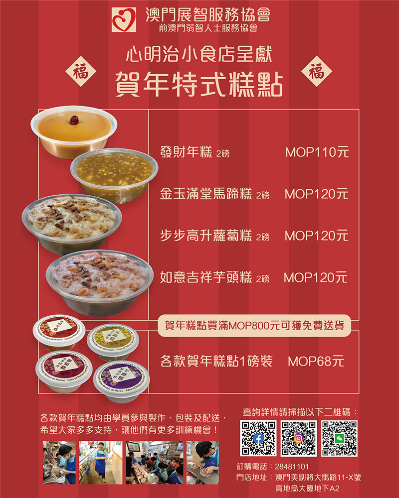 心明治小食店今年繼續推出一系列賀年糕點,有發財年糕、金玉滿堂馬蹄糕、步步高升蘿蔔糕及如意吉祥芋頭糕四款,款款好味亦帶有吉祥意味。賀年糕點皆由本店培訓的學員參與製作、包裝及配送,大家的支持有助學員更好地提升工作技能,並使他們進步成長。現買滿800元可獲免費送貨,今年新年較過往早,訂購請從速。