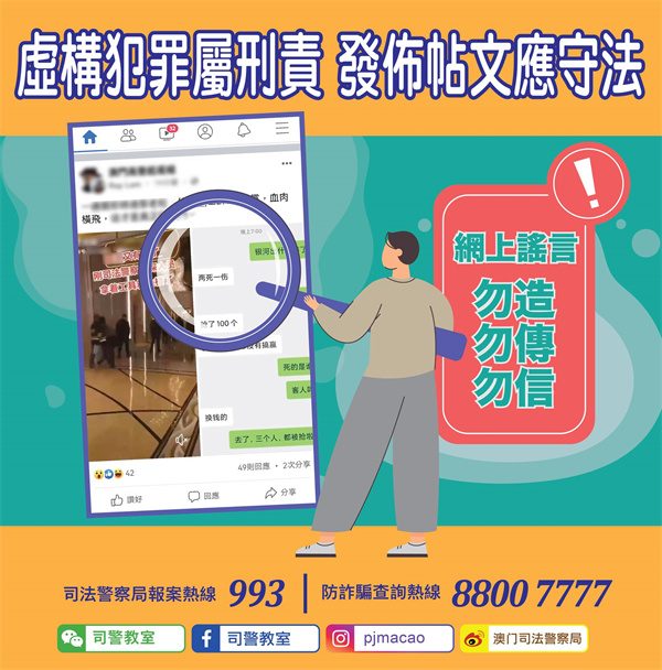 虛構犯罪不僅浪費警力,影響社會正常運作,更會造成公眾不安,司法警察局對相關行為予以強烈譴責。司法警察局呼籲公眾切勿輕信及隨意轉發網上未經證實之消息,如發現懷疑犯罪情況,應立即向警方舉報或求助。