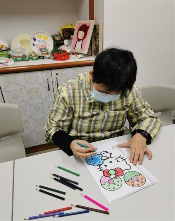 中心每月都會開展藝術課程興趣班,希望培養服務使用者的藝術才能,啟發他們的想像力、能訓練注意力專注集中,培養耐心毅力及舒解精神壓力。早前,中心展開了立體圖案剪貼班,阿燕(化名)是參加者之一,她是一位自閉症人士,有一定的溝通能力,對畫畫、剪貼和圖畫著色很有興趣,喜歡使用繽紛的色彩風格,顏色配合亦很協調和美麗,在訓練過程中她很認真和投入。過去亦曾經多次代表中心參加其他機構主辦的自閉症繪畫比賽並取得多個獎項。早前更代表啟能中心畫了一幅生肖畫(老虎),印製在展智服務協會(前澳門弱智人士服務協會)枱曆上作宣傳及推廣之用,令阿燕從中得滿滿的成功感。