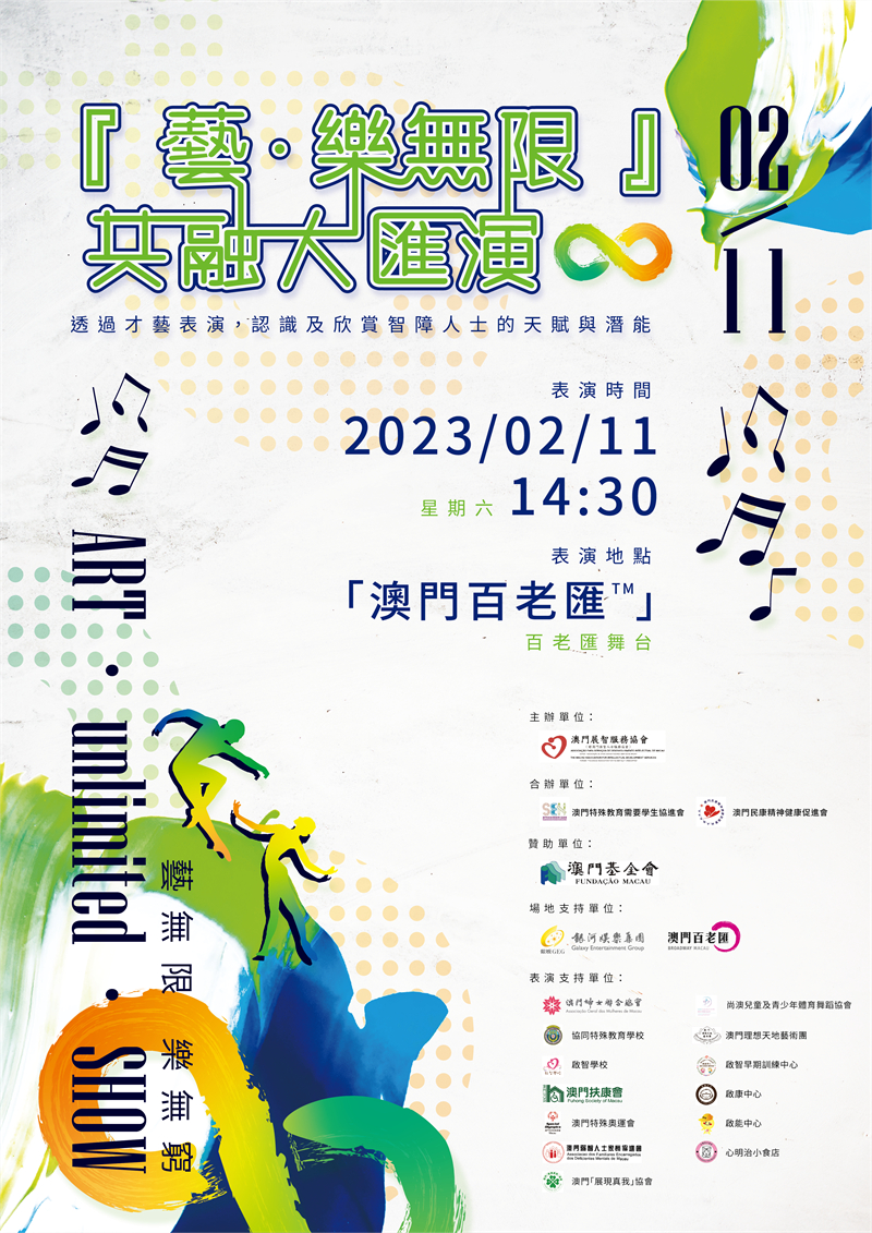 各位親愛的會員大家好,由澳門展智服務協會主辦的『藝・樂無限』共融大匯演即將在銀河百老匯上演啦,相信大家都期待已久了。這次受邀請的表演隊伍都多才多藝,他們會以藝術表演盡顯自己所長,希望讓社會大眾都認識及欣賞特殊人士的天賦與才能。我們的支持就是為共融出一份力,2月11日下午2點30分銀河百老匯舞台見啦,多謝大家