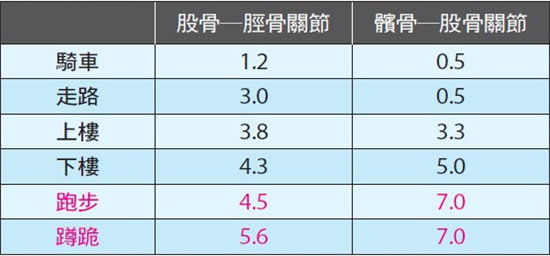 這兩個關節如果長期承重,就有可能因為軟骨磨損而演變成退化性關節炎。右頁表為不同的活動對這兩個關節的負荷程度。
