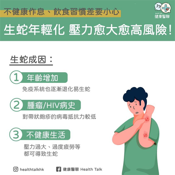 3. 免疫力下降:不健康的作息和飲食習慣會使身體免疫力下降,而病群也會隨即入侵身體,容易誘發潛伏在體內的帶狀皰疹病毒,從而感染病毒並有生蛇的痕跡。因此近年生蛇也有年輕化,而壓力過大、過度疲勞等都有機會導致生蛇,需要在日常多放鬆來改善問題。