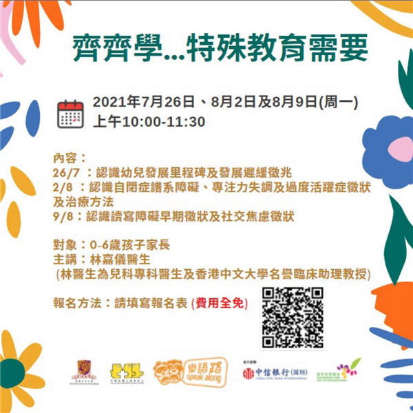 日期:2021年7月26日、8月2日及8月9日(周一)時間:上午10:00-11:30對象:0-6歲孩子家長主講:林嘉儀醫生 (兒科專科醫生及香港中文大學名譽臨床助理教授)形式:zoom報名方法:請填寫報名表 https://forms.gle/FUNoWZwMwCnpf53L7