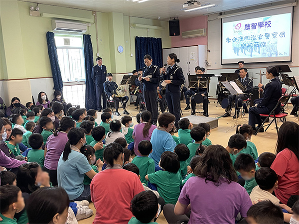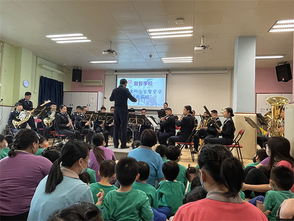 警察樂隊除為師生表演不同的曲目外,亦介紹了樂團中演奏的樂器並設答問環節,學生們對此深感興趣並踴躍回答。樂隊以「孤勇者」作為最終曲目,演奏期間有不少學生隨著音樂打拍子並扭動身體,最後在一片掌聲中結束表演。