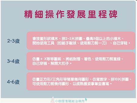 精細動作的發展也跟身體近端穩定度、手部肌力、肌耐力、手眼協調、手指獨立動作、雙手共同合作能力等息息相關。