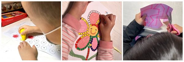 ☑提升手部肌力:玩雪花片、積木、黏土等等;塗鴨、色紙撕貼畫、投錢幣、用鎳子夾豆豆、剪紙等等工具操作,完成的作品還能讓孩童獲得成就感!