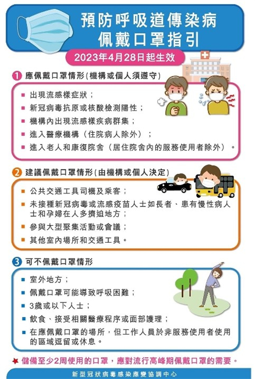 新型冠狀病毒感染應變協調中心(下稱應變協調中心)宣布,參考國家及世界各地防控新型冠狀病毒感染和其他呼吸道傳染病的指引,由4月28日起調整預防呼吸道傳染的佩戴口罩指引。調整後的佩戴口罩指引,根據不同的情形分為:一、應佩戴口罩;二、建議佩戴口罩;三、可不佩戴口罩。值得指出的是,個人和機構須遵守應佩戴口罩的要求,而在建議佩戴口罩的情形下,若機構沒有此要求,個人可因應情況自行決定是否佩戴口罩。