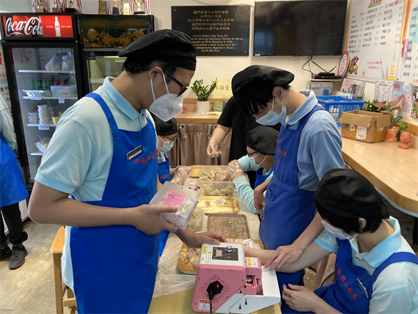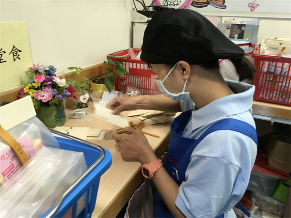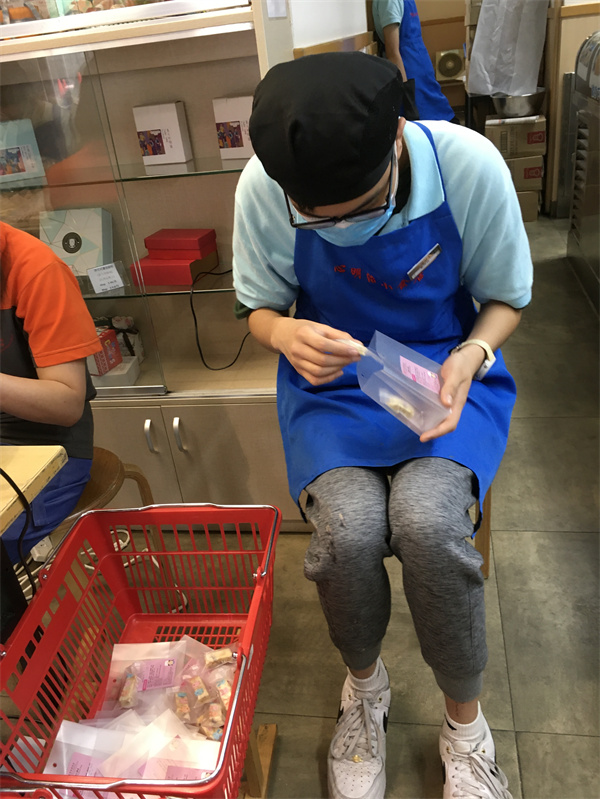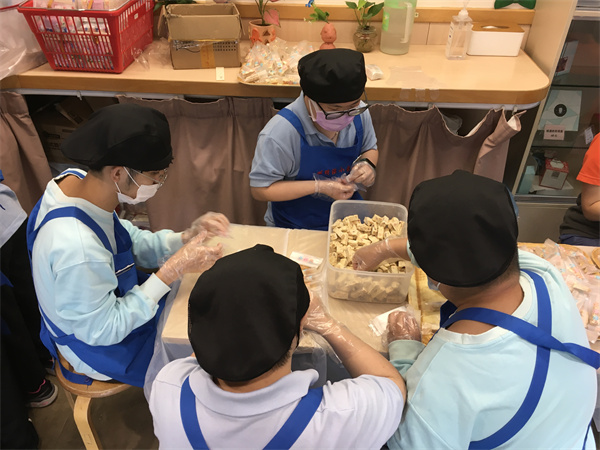 心明治小食店承接各種禮盒或禮包的訂單,讓學員有參與包裝工作的機會,以近年本店出品為例,學員從份量的量度、製作過程到產品的包裝,以流水線形式由學員們共同參與,學員們同心協力完成目標,體現團隊合作精神。包裝的工作亦都考驗學員精細動作的掌握,密集式的包裝訓練能夠使他們快速進步。