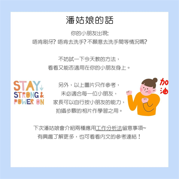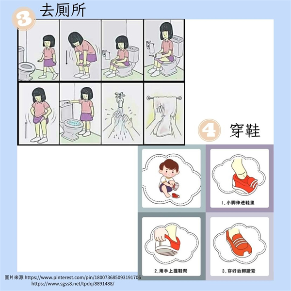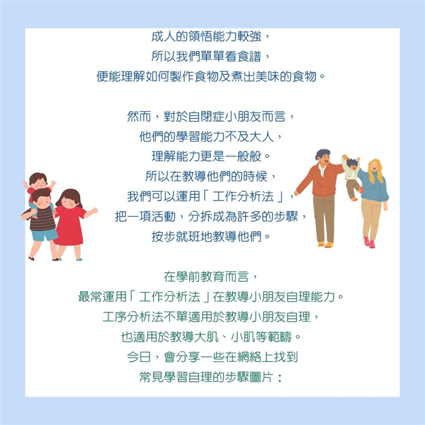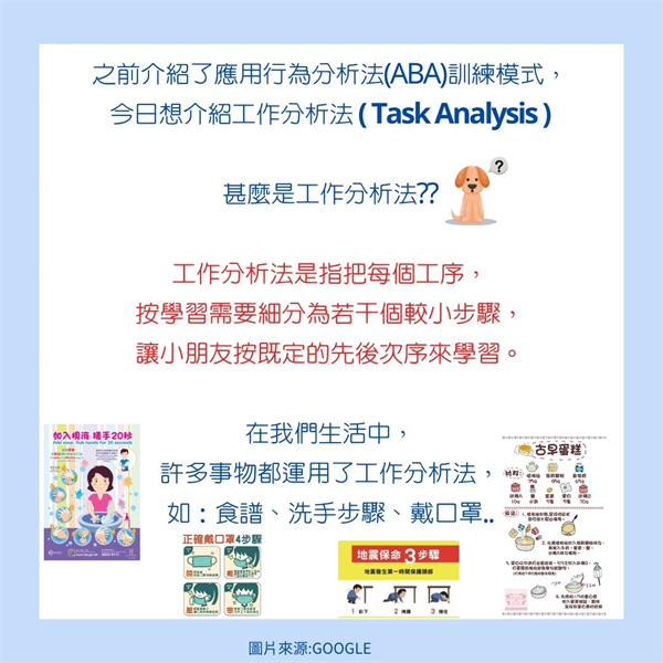 由於自閉症小朋友在學習方面需要大量的視覺提示,運用工作分析法,利用圖片作為視覺提示,按步就班地教導小朋友,有效地提升自閉症小朋友的學習效益。