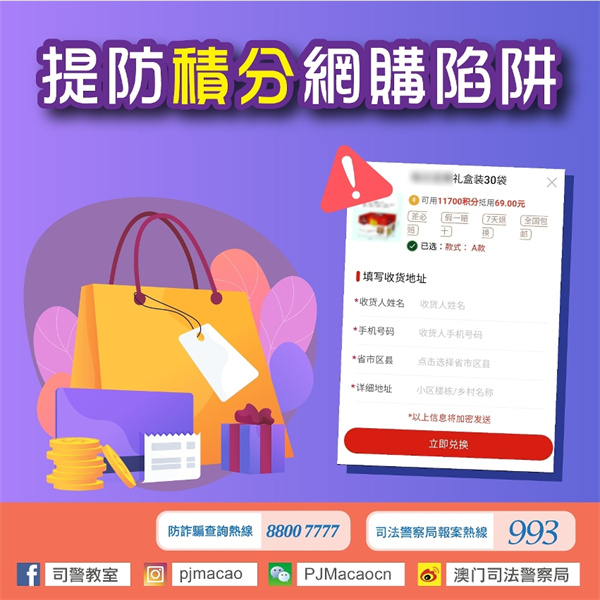 近日司警局發現有不明人士向市民隨機發送“積分即將無效”的短訊,稱積分即將過期作廢,可以點擊短訊附帶的連結登錄“商城”兌換商品,然而登錄所謂“商城”後,市民除了需輸入個人資料外,兌換商品更需即時以電子方式支付額外金錢,而積分並沒實際用途。