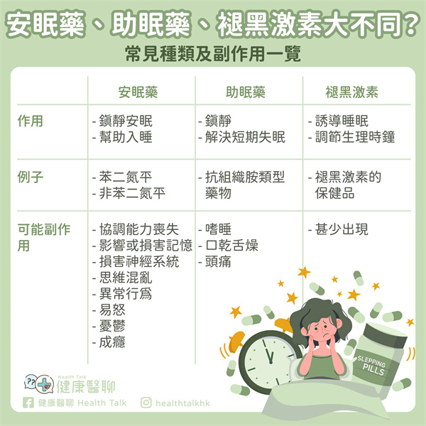市面上可以找到褪黑激素的保健品,雖然並非屬於安眠藥,但它可以令血液中的褪黑激素急劇上升,有助於誘導睡眠、調節生理時鐘,對於需要調整睡眠時間的人也有幫助。不過褪黑激素只能短期使用,因為褪黑激素是一種天然激素,相對比較安全,使用後也較少出現上癮或反複使用後藥效減弱的情況。