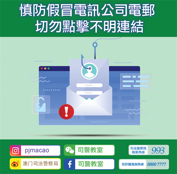 近日司警局接獲市民舉報,指收到假冒本澳一電訊公司名義發出的電子帳單郵件,並指示事主點撃電郵內附有的連結,登錄網上銀行支付有關帳單,藉此套取銀行帳戶或信用卡資料。